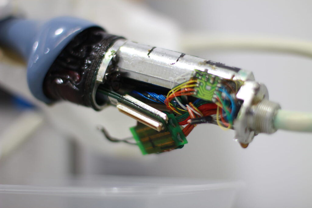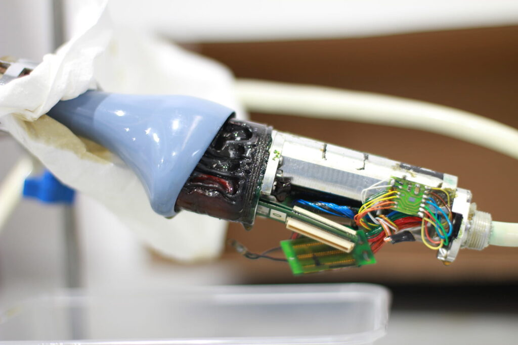 Over time, the main bladder has decayed, leaking coupling fluid throughout the device and severely discoloured it’s usually clear appearance. Notice also the green ‘mould-like’ substance – copper oxide which has built up in the crevices of the probe due to corrosion. If this probe was brought into us just a little sooner the repair would have been much easier and a lot cheaper for our client.