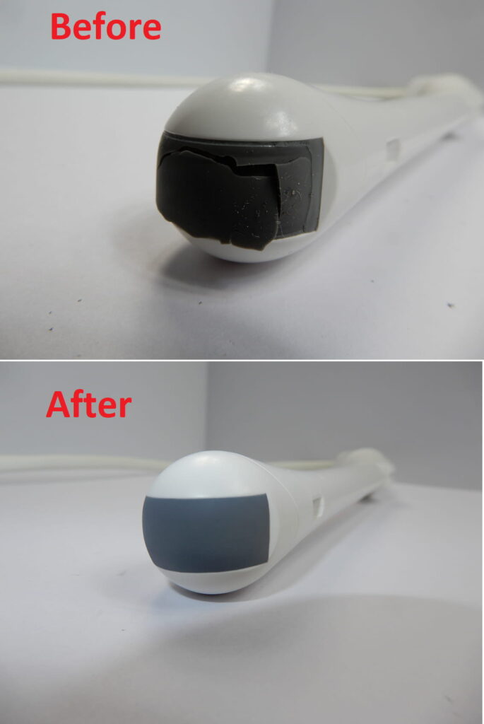 Before and after on a ultrasound probe lens. Does your probe have lens problems? ProbeLogic’s staff eat lens problems for breakfast. Call us today! 1300 611 503.